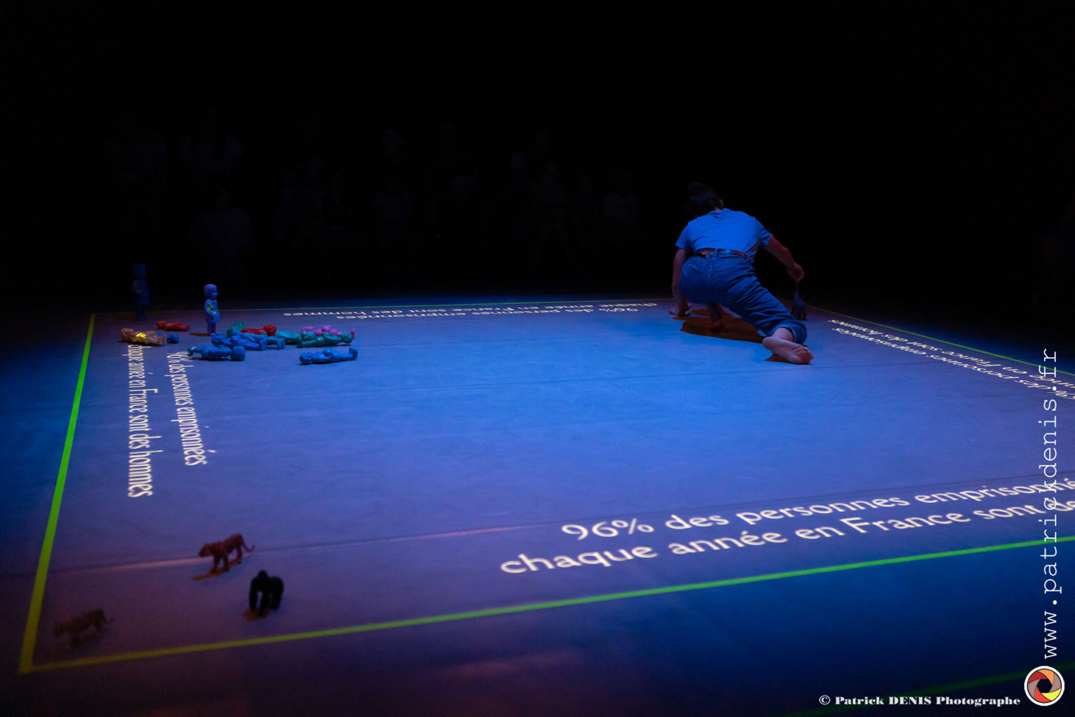 Les statistiques projetés sont issues du travail de l’historienne « Lucile Peytavin » qui a analysé les chiffres du ministère de la Justice française et qui annonce qu’une majorité des infractions et des comportements asociaux sont commis par des hommes, ce qui induit un pourcentage de 96% d’hommes et de 4% de femmes emprisonné.e.s en France chaque année.